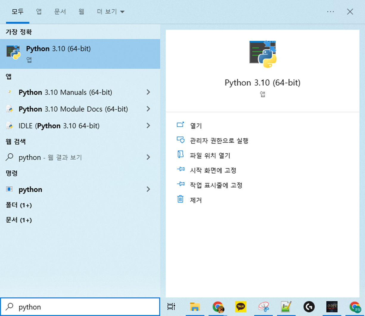 검색창에서 python이 잘 설치되었는지 확인